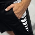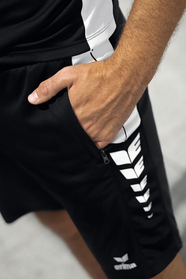 Shorts i slitstarkt funktionsmaterial. Elastiskt resår och dragsko i midja. Fickor med blixtlås. Ingen innerbyxa.